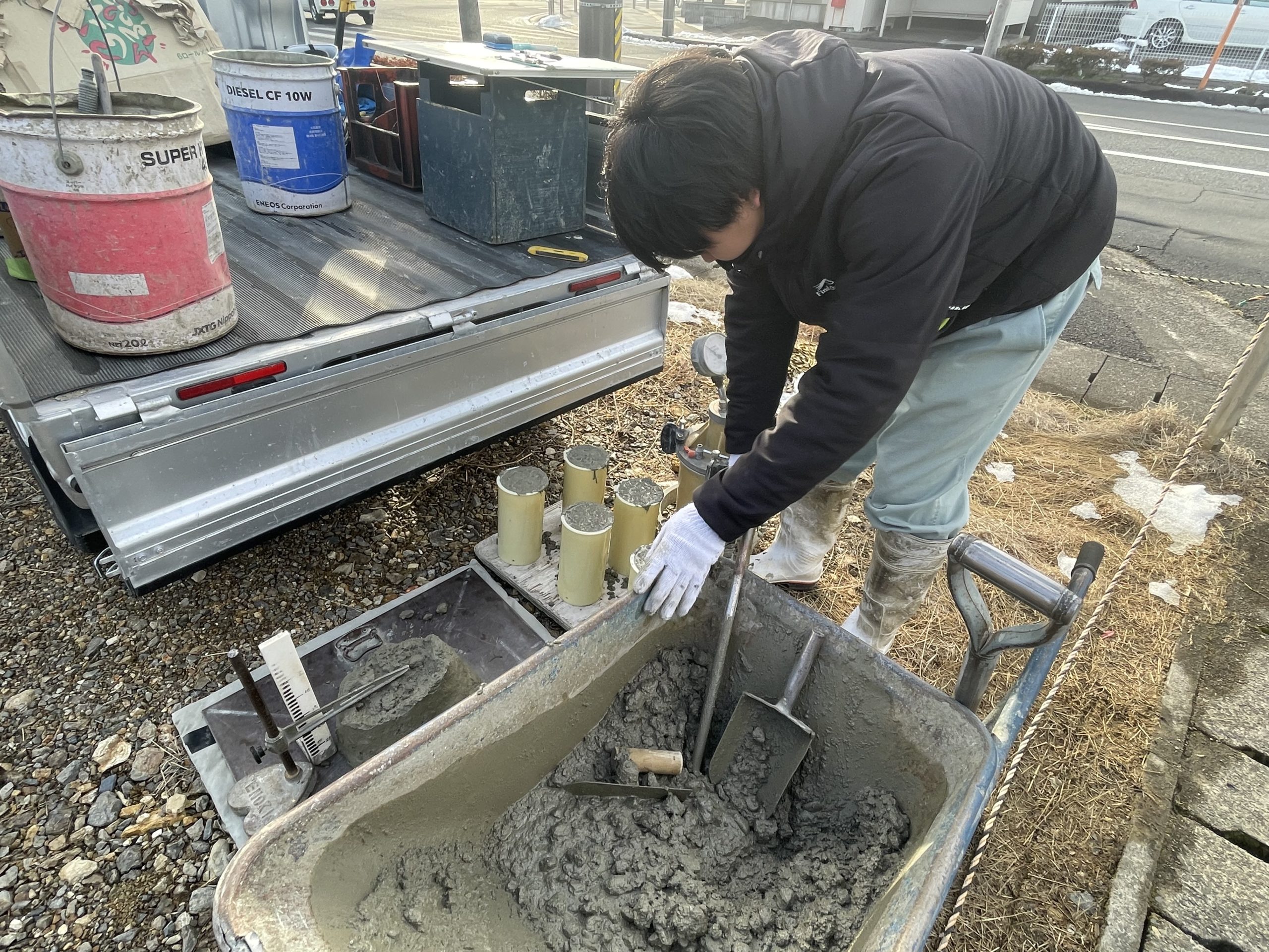 適正なコンクリート強度が発現したかどうか、テストピースを後日、破壊試験して強度を調べてもらいます。