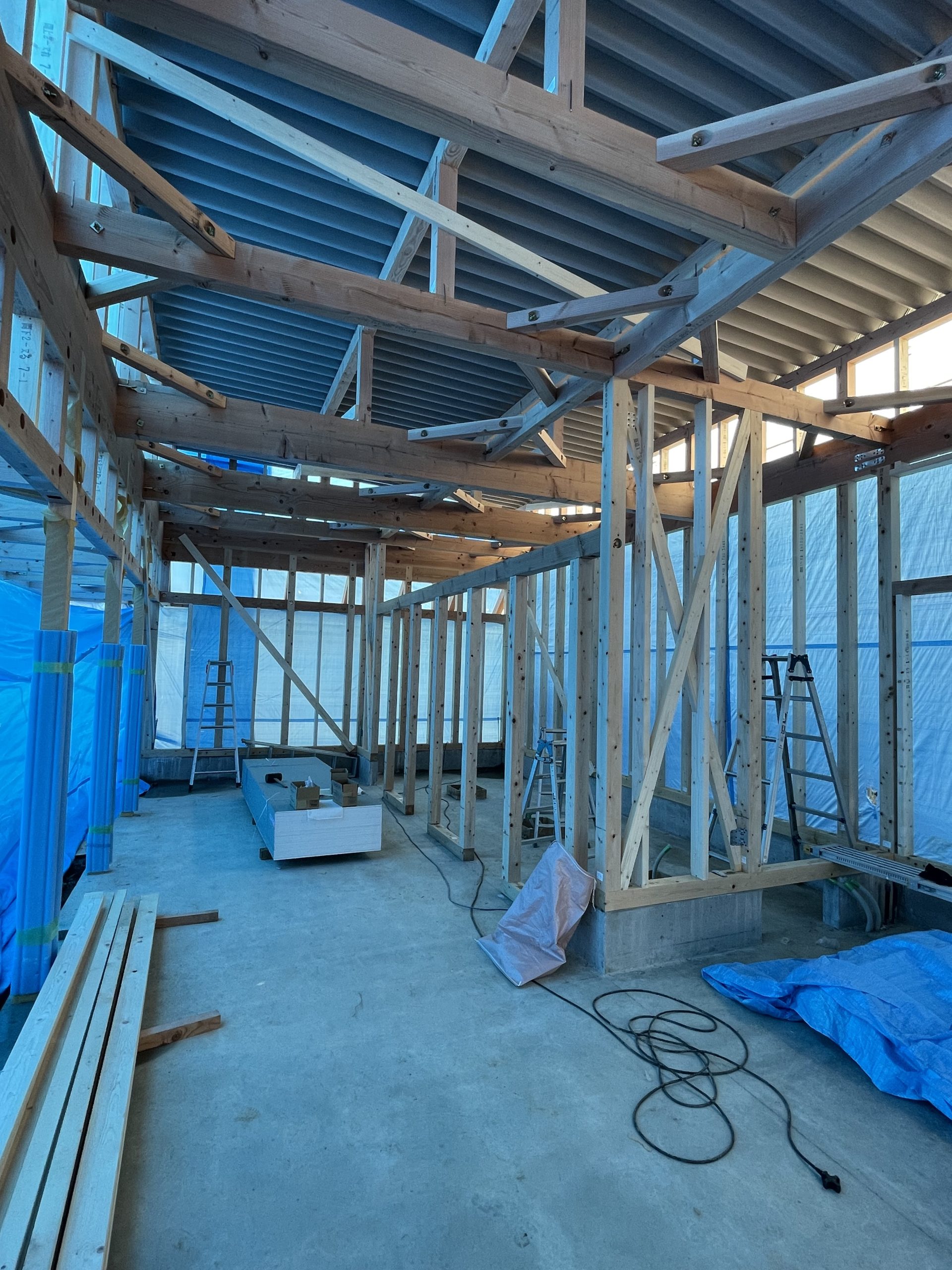 木造の柱や梁組、筋交のことを、私たちは軸組とら呼びますが、軸組の耐力壁に必要な金物を取り付けています。
