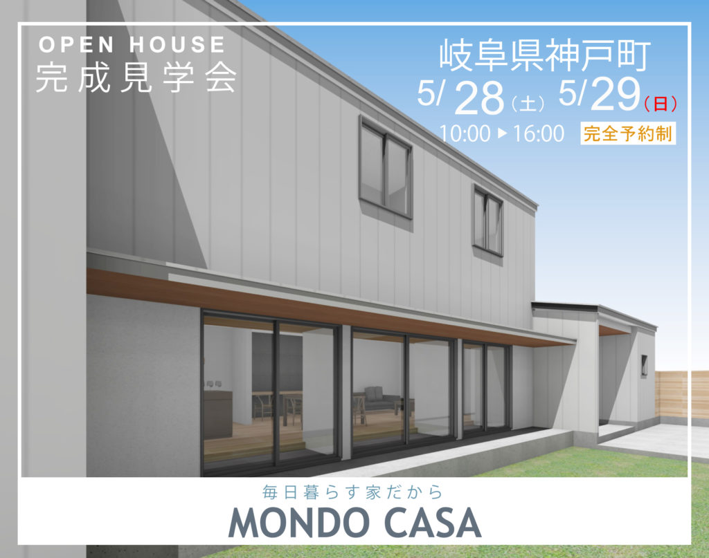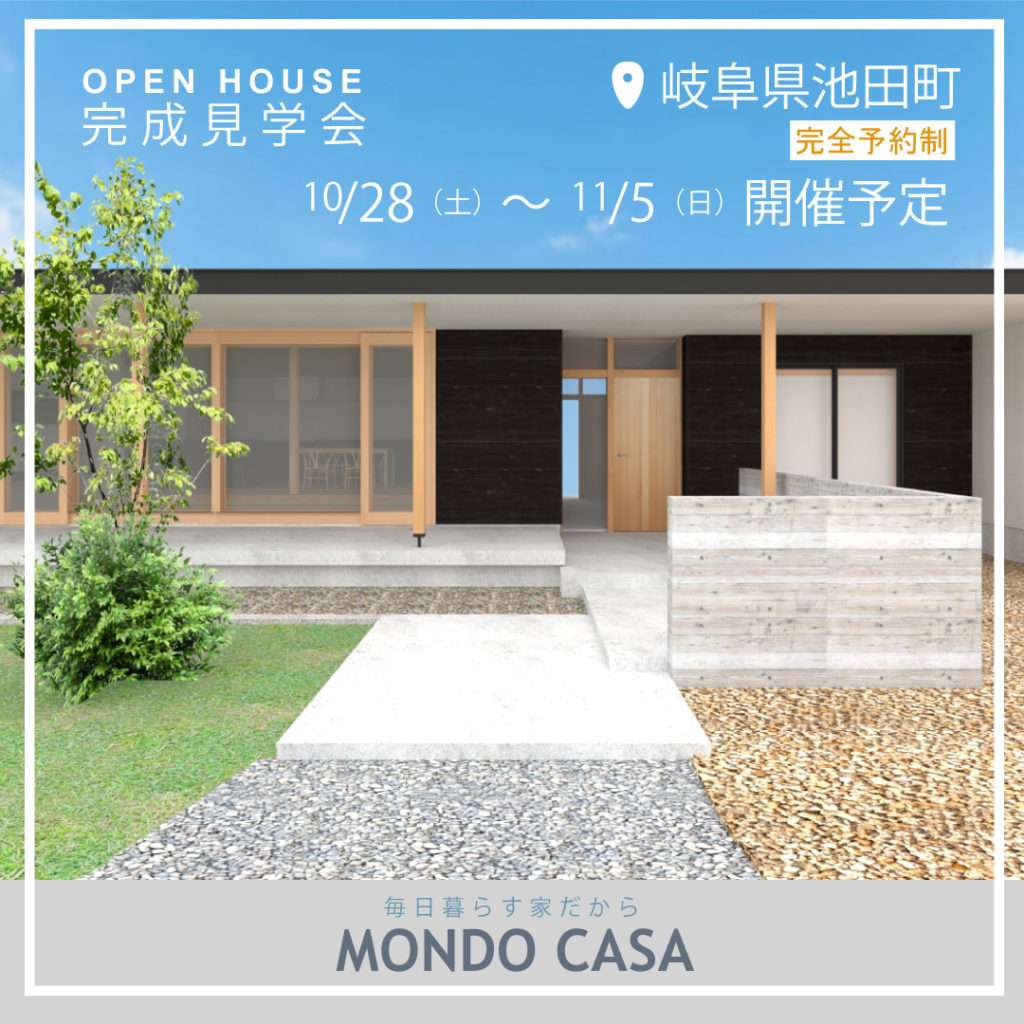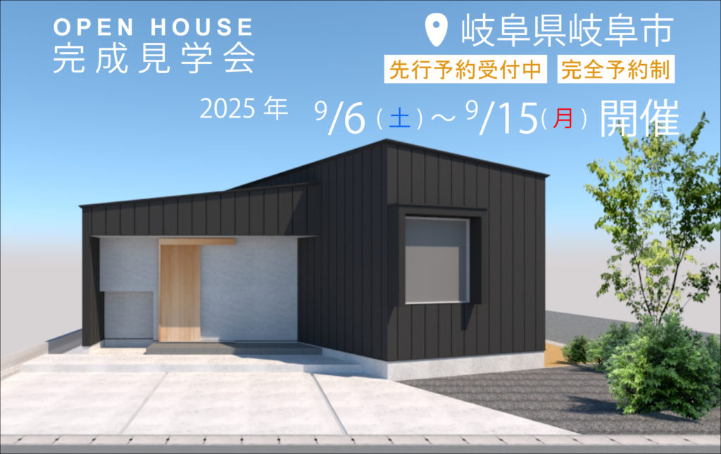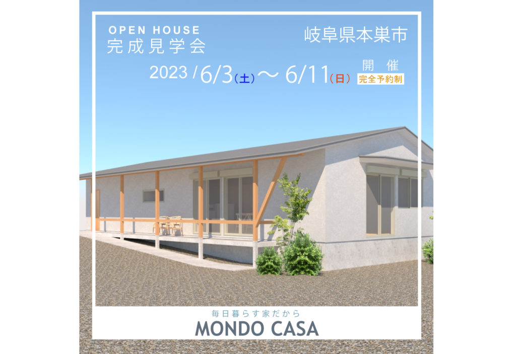 2023年6月3日(土)~6月11日(日) 岐阜県本巣市 完成見学会を開催いたします。 先行予約の受付を開始させていただきます。 ご興味のある方は ウェブサイトからお申込みください。